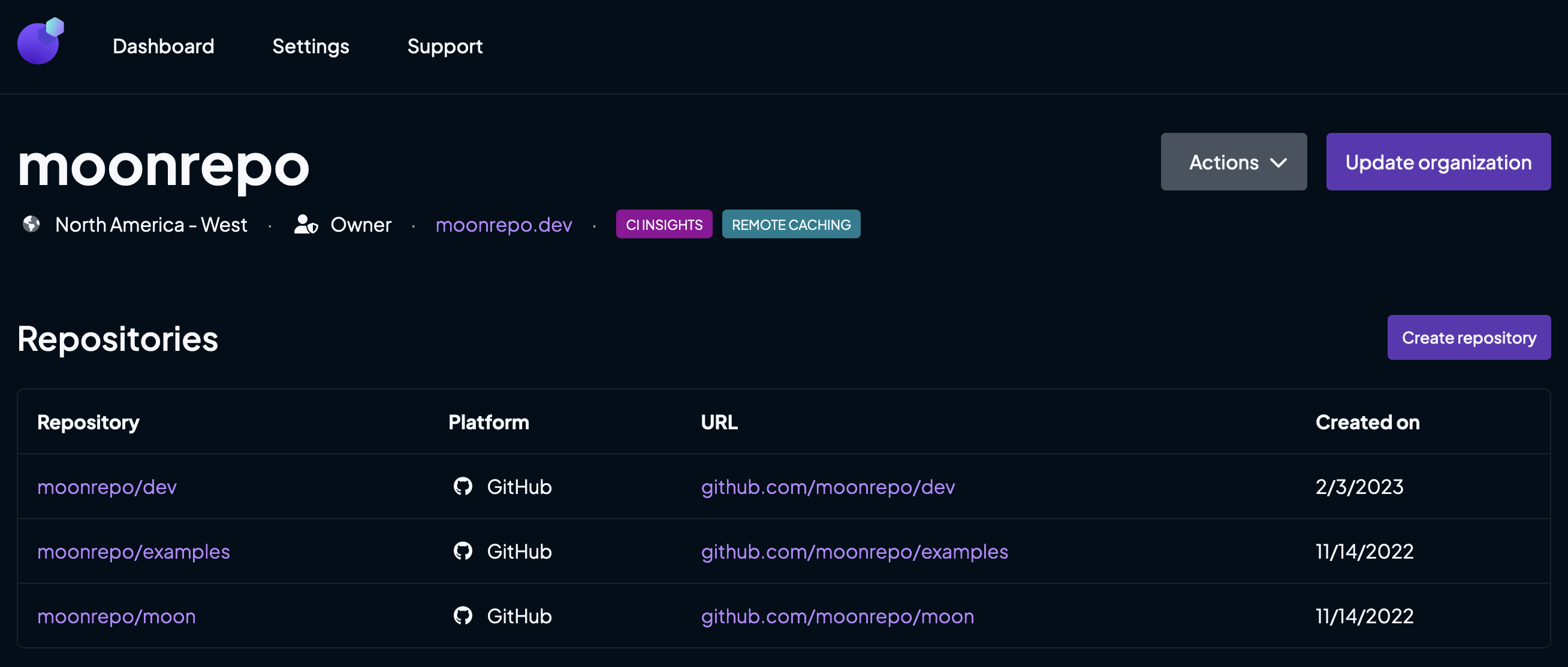 CI runs (via moon ci), and all moon tasks (actions) that ran within each job. We use this